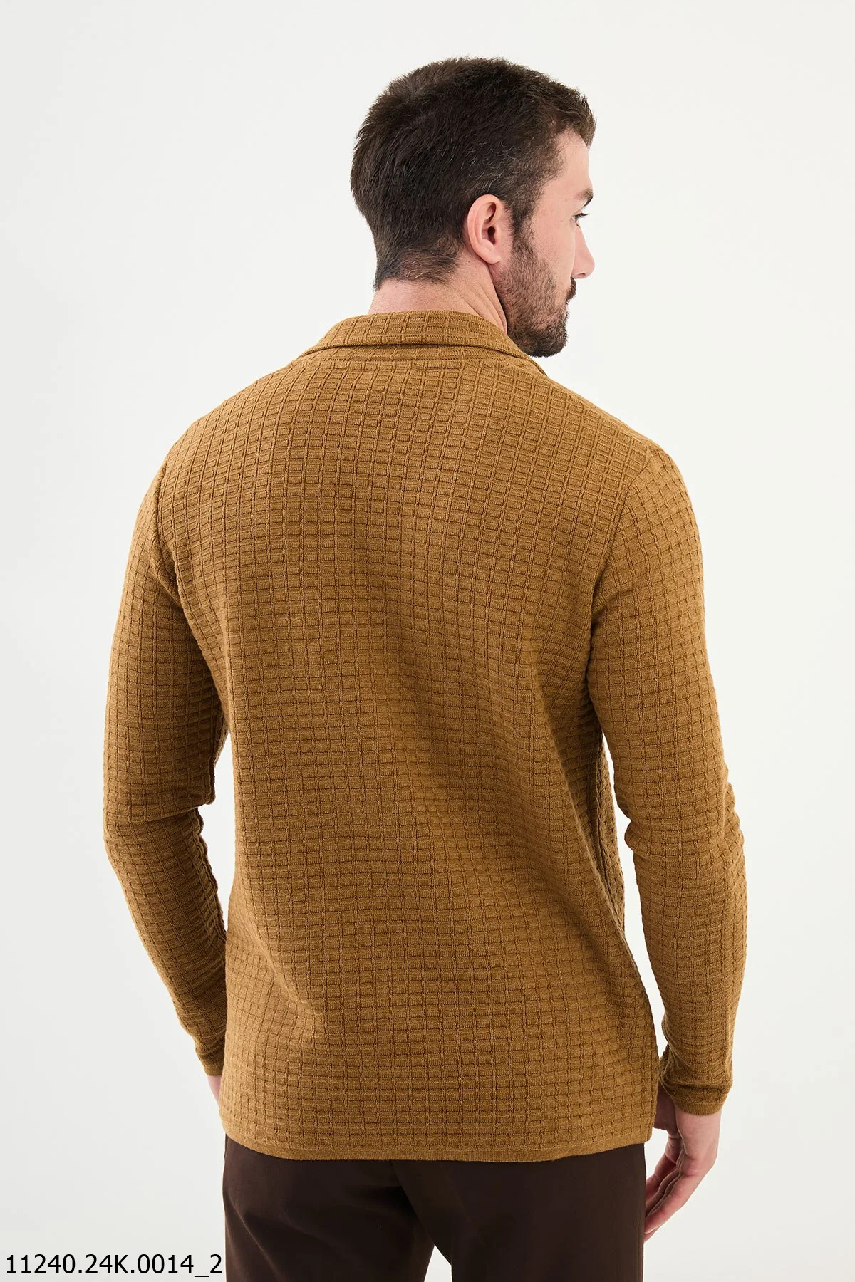 Add a sophisticated touch to your wardrobe with this Camel Textured Cardigan Blazer, designed for versatile wear. Crafted from a premium blend of 55% cotton and 45% polyester, this cardigan blazer offers a lightweight yet cozy fit. Its camel-tone finish and intricate textured pattern deliver an effortlessly chic appeal, perfect for casual outings or smart-casual events.