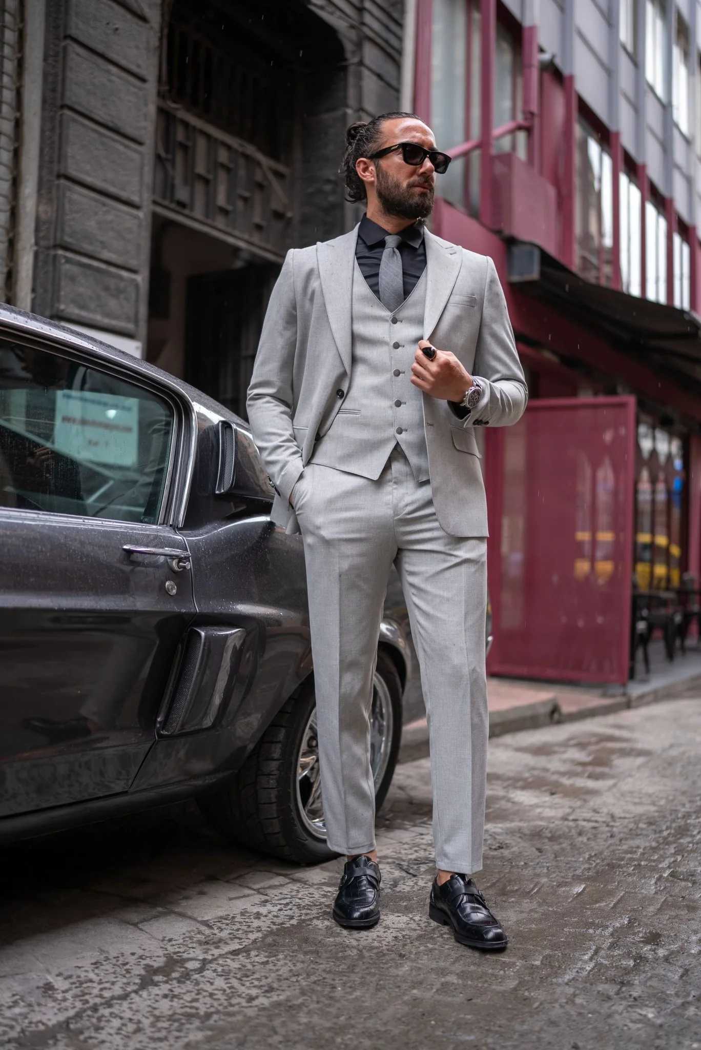 The sleek gray tone exudes modern elegance, while the full setâjacket, vest, pants, shirt, tie, and accessoriesâmakes styling effortless. With its crisp silhouette, flap pockets, and structured double-button closure, this suit is ideal for warm-weather weddings both at home and abroad.