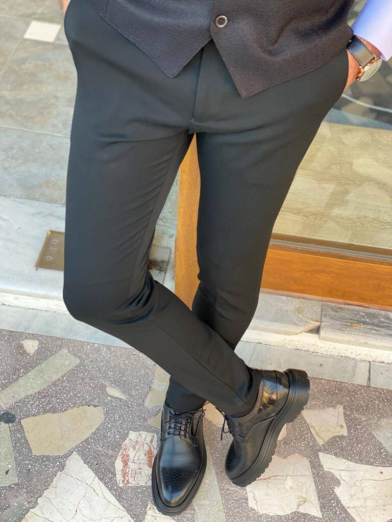 These trousers look best with a dress shirt, tailored blazer, and leather loafers or lace-up derbies. For more refined layering, you can also style them with a waistcoat or turtleneck.