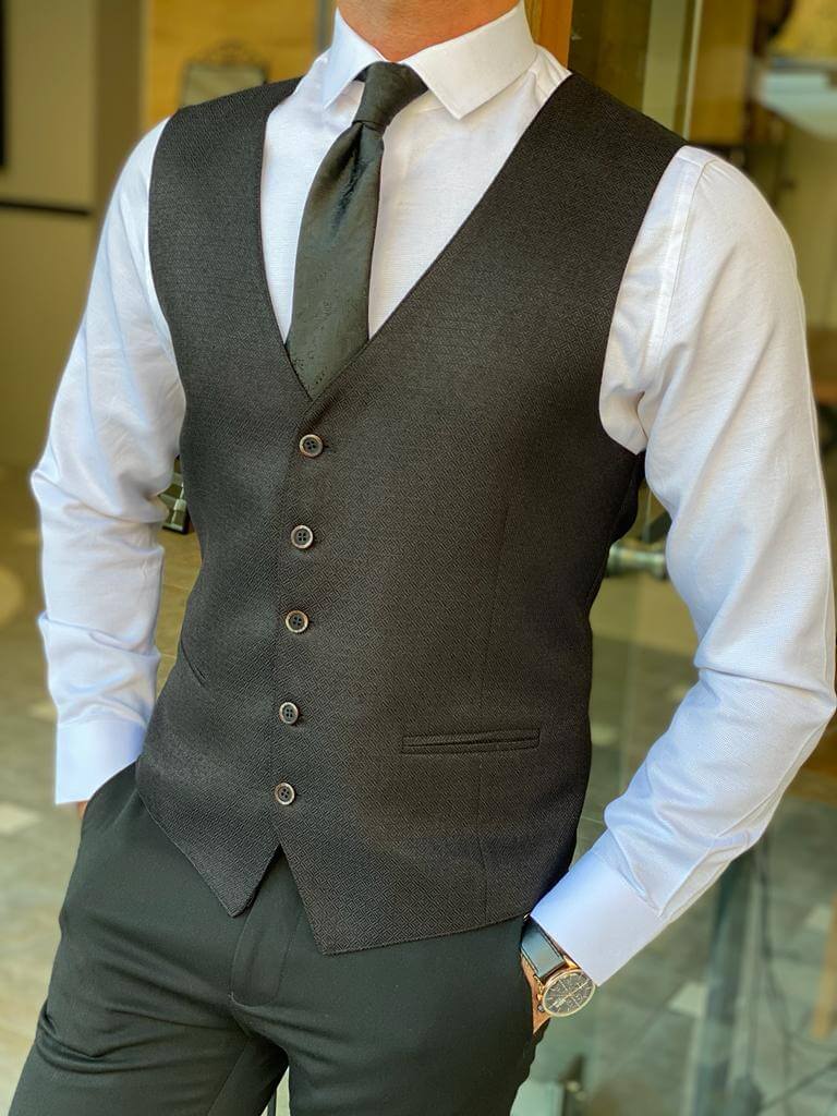 The waistcoat fabric is composed of 20% wool, 30% polyester, 40% Viscone, 5% Elastane.
