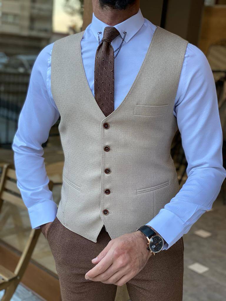 The waistcoat fabric is composed of 20% wool, 30% polyester, 40% Viscone, 5% Elastane.