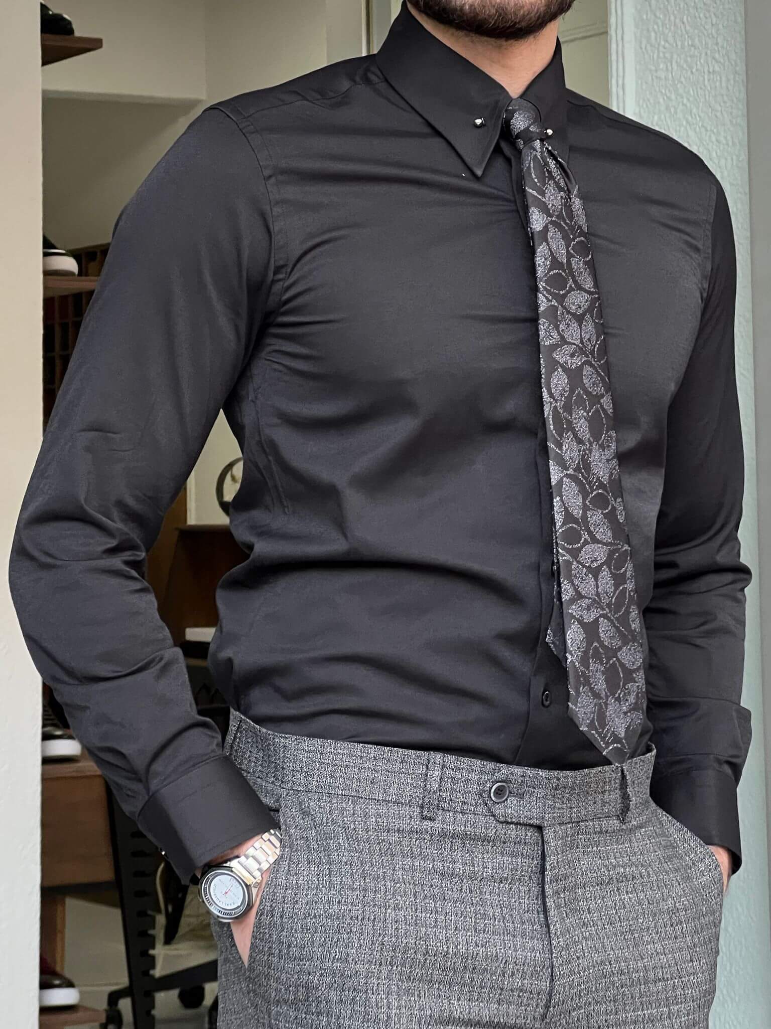 Featuring a high-quality slim-fit needle collar black shirt.Â
