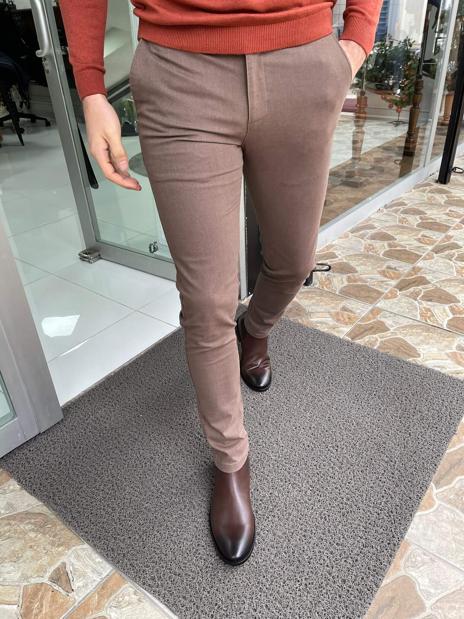 Upgrade your fall wardrobe with these slim-fit light brown trousers, crafted from a high-quality blend of 80% cotton, 15% wool, and 5% Lycra. These trousers are designed with a tapered silhouette and practical side pockets, and balance refined comfort and polished style. Ideal for formal events or business casual looks.