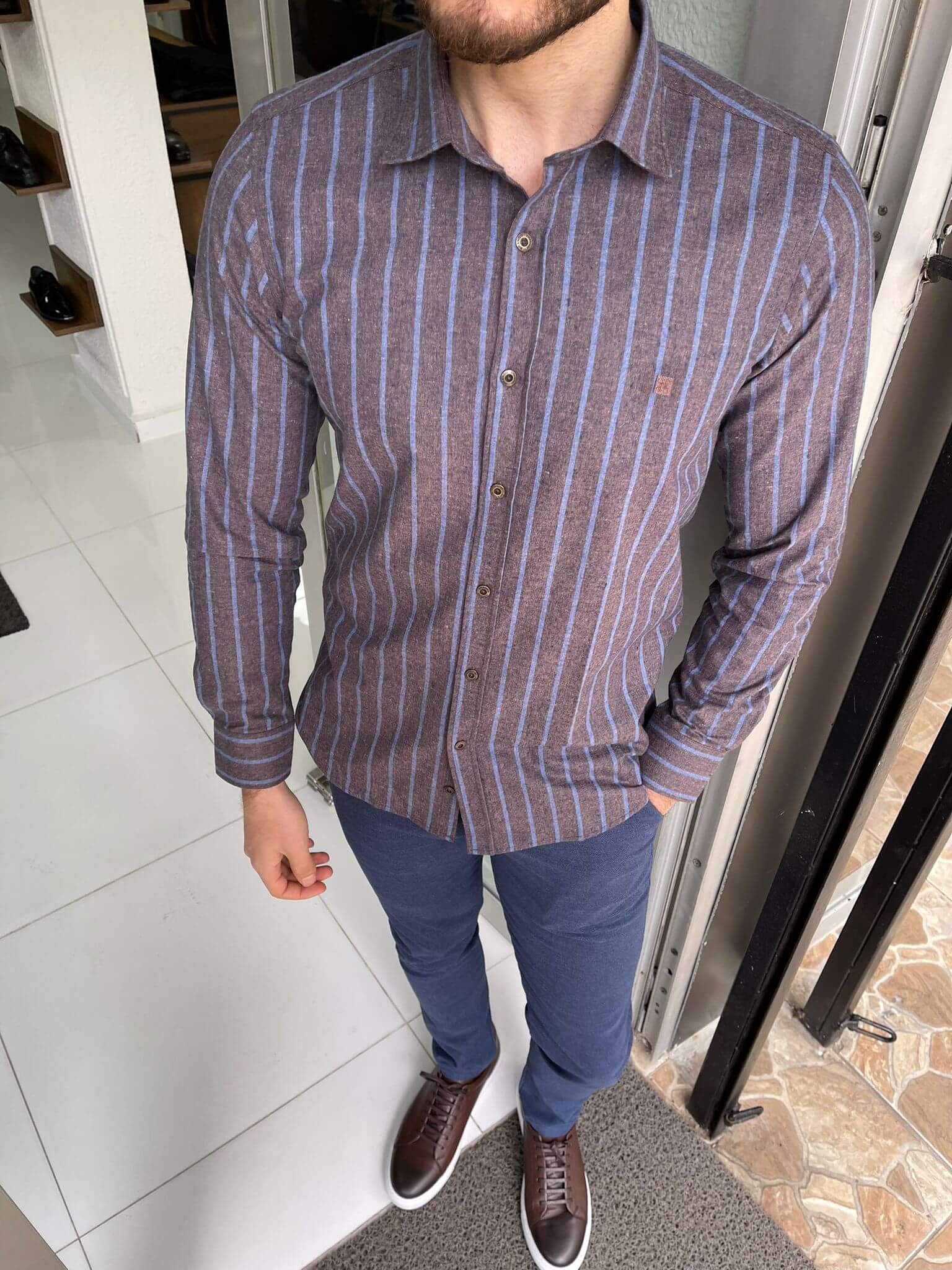 Features a men's striped slim-fit brown shirtÂ